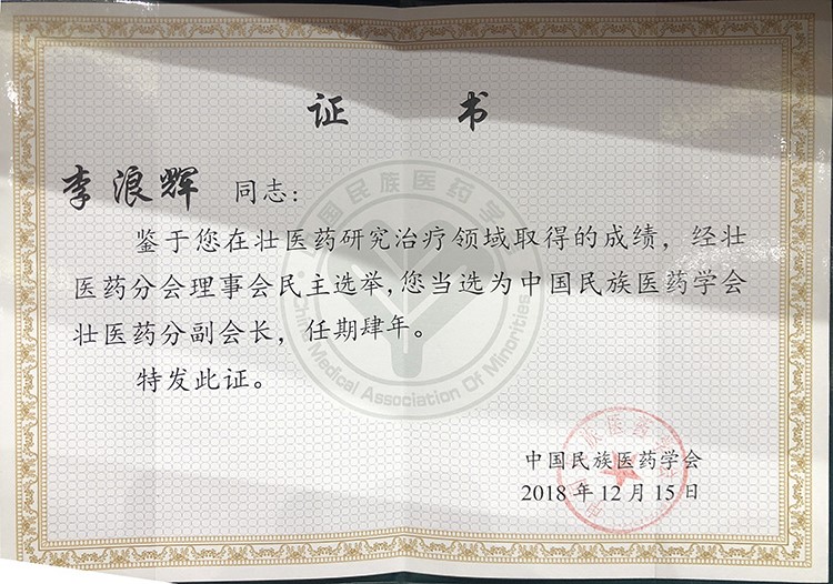 熱烈慶祝,12月15日,強(qiáng)壽集團(tuán)董事長(zhǎng)李浪輝因壯醫(yī)藥研究治療領(lǐng)域取得的成績(jī),經(jīng)壯醫(yī)藥分會(huì)理事會(huì)民主選舉,當(dāng)選為中國(guó)民族醫(yī)藥學(xué)會(huì)壯醫(yī)藥分會(huì)副會(huì)長(zhǎng)!!!