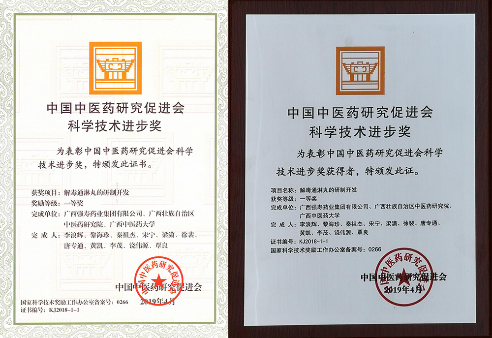 廣西強(qiáng)壽藥業(yè)集團(tuán)有限公司獨(dú)家研發(fā)生產(chǎn)的治療非淋民族藥——解毒通淋丸榮獲2018年中國(guó)中醫(yī)藥研究促進(jìn)會(huì)科技進(jìn)步一等獎(jiǎng)(省部級(jí)獎(jiǎng)項(xiàng),一等獎(jiǎng)項(xiàng)類別中排名第1位)。