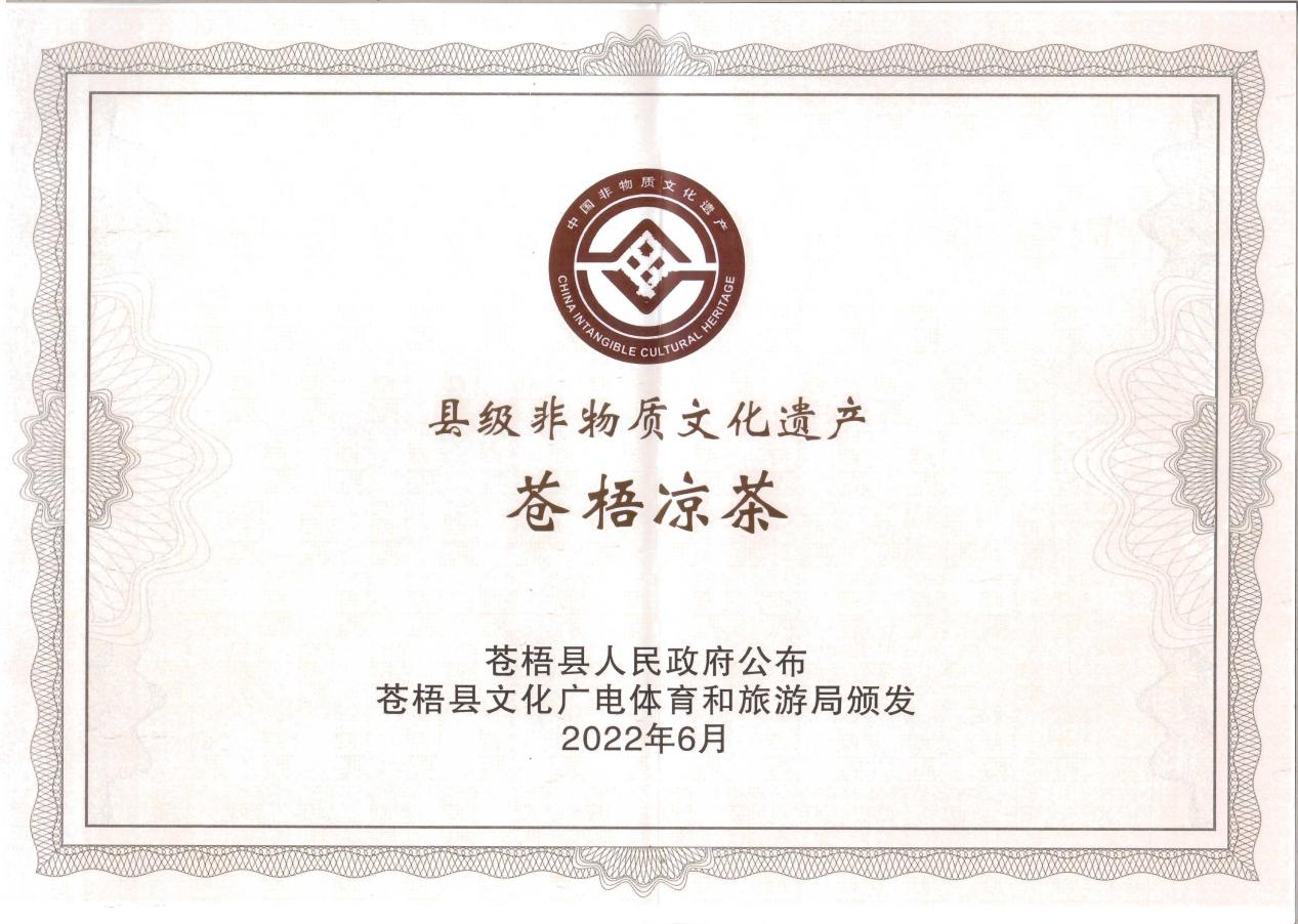 2022年6月,蒼梧涼茶成功申請非物質文化遺產!由蒼梧縣人民政府公布,蒼梧縣文化廣電體育和旅游局頒發(fā)縣級非物質文化遺產證書。