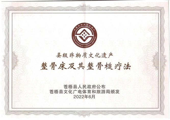 熱烈祝賀廣西強(qiáng)壽藥業(yè)集團(tuán)有限公司整骨床及其整骨槌療法喜獲縣級非物質(zhì)文化遺產(chǎn)項(xiàng)目。證書由蒼梧縣人民政府公布,蒼梧縣文化廣電體育和旅游局頒發(fā)。